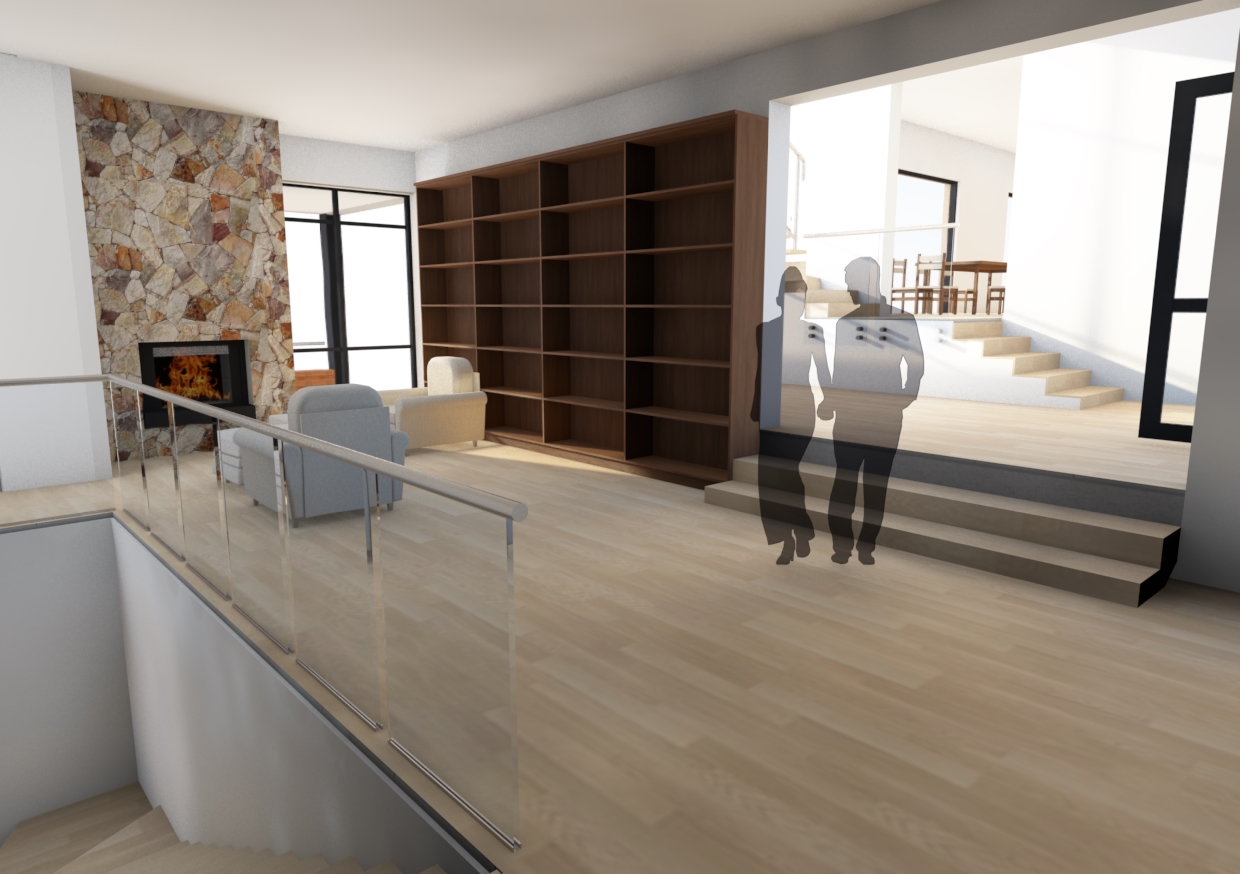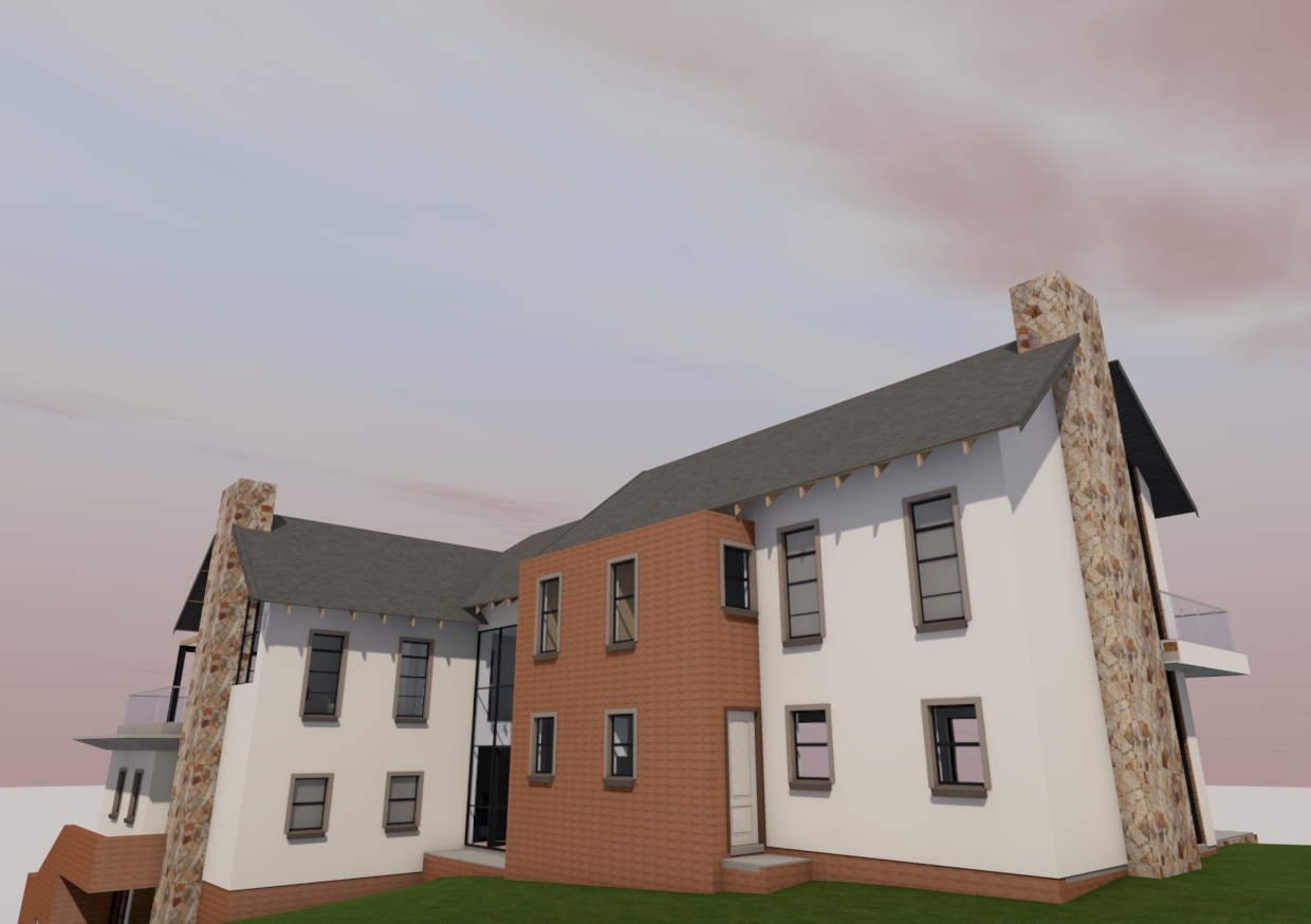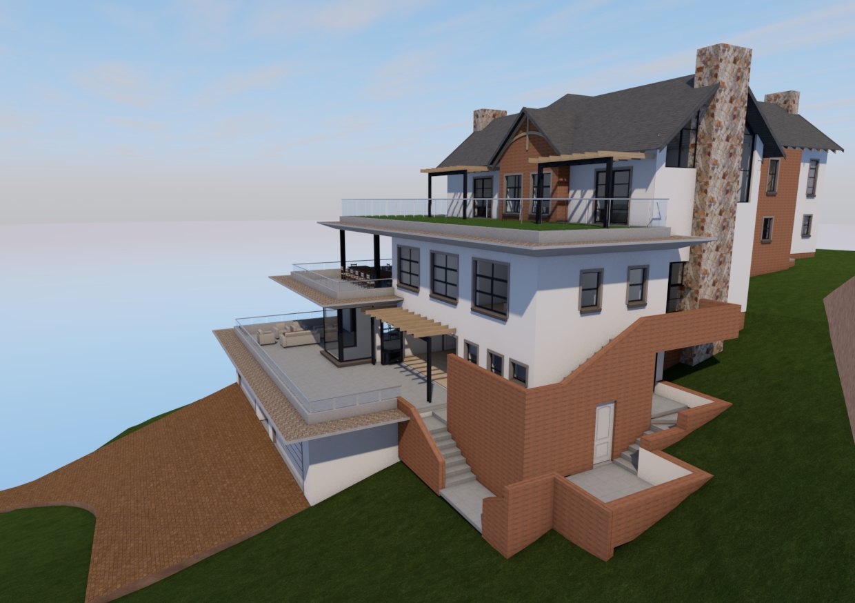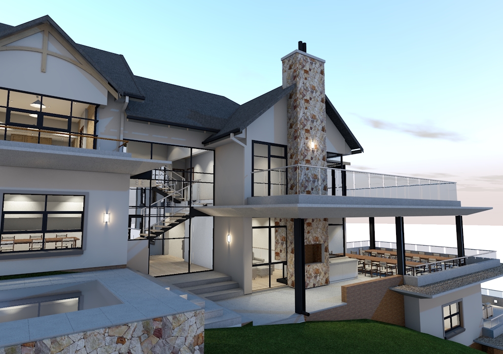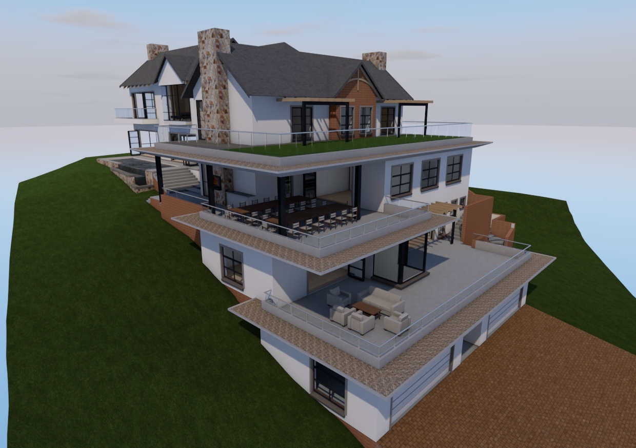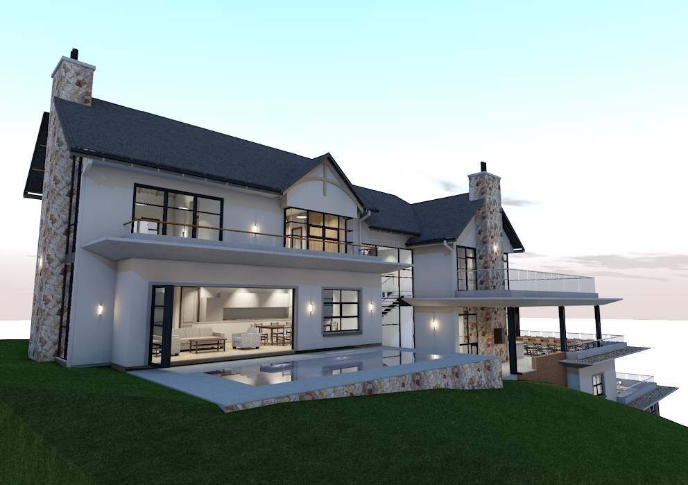 This contemporary farm style home is located in the picturesque and nature-embracing Heidelberg Kloof Estate. The 1 400m2 east sloping site drops 11m from the top street level to the bottom which informs the terraced levels of the design. The steep slope also drove the need for expansive patios and balconies which become the outdoor garden, upstairs off the children’s bedrooms, and living spaces on ground level.