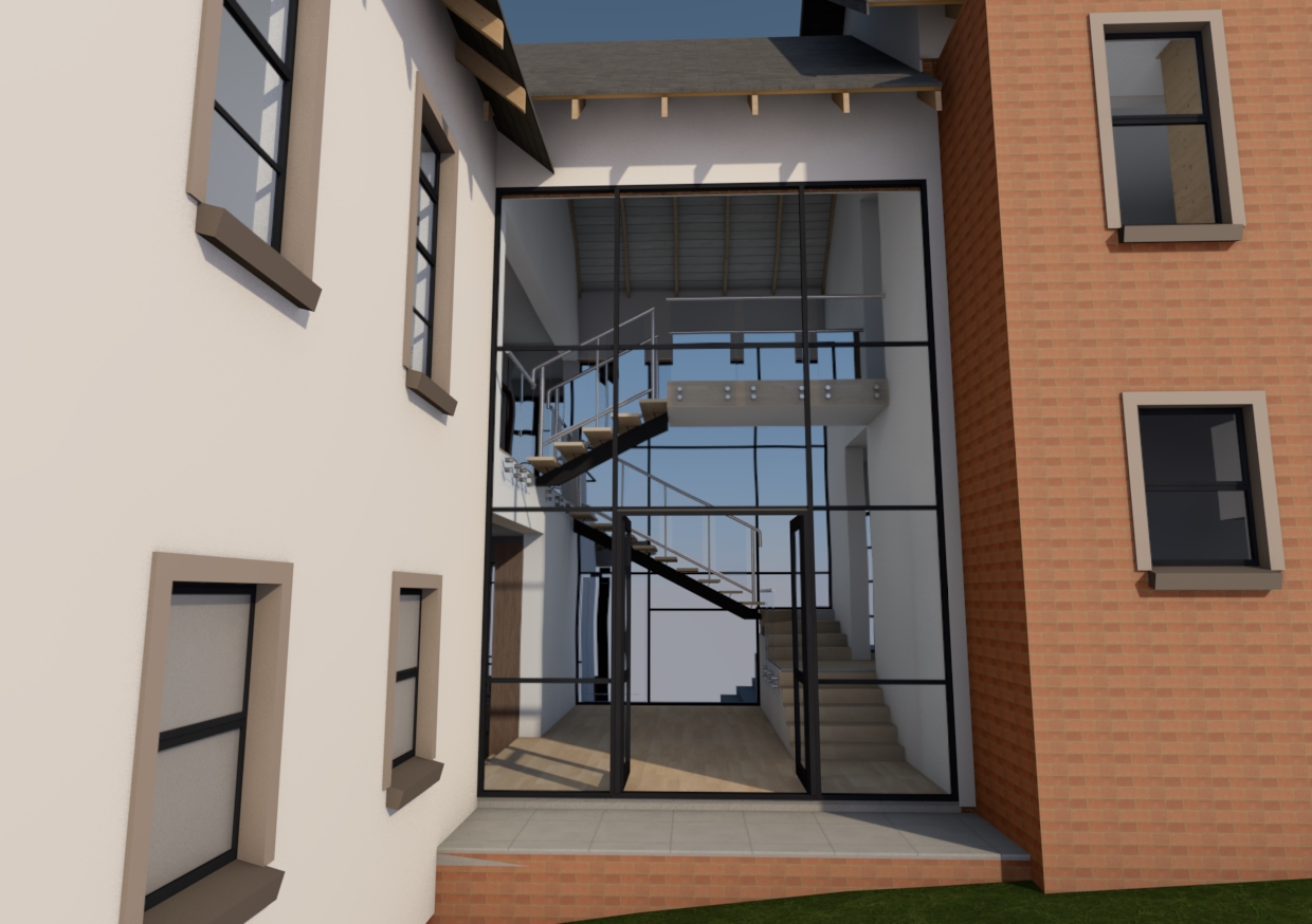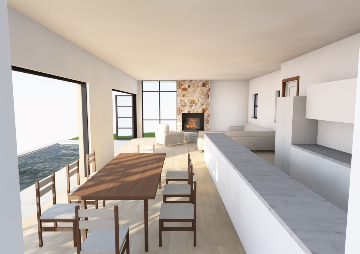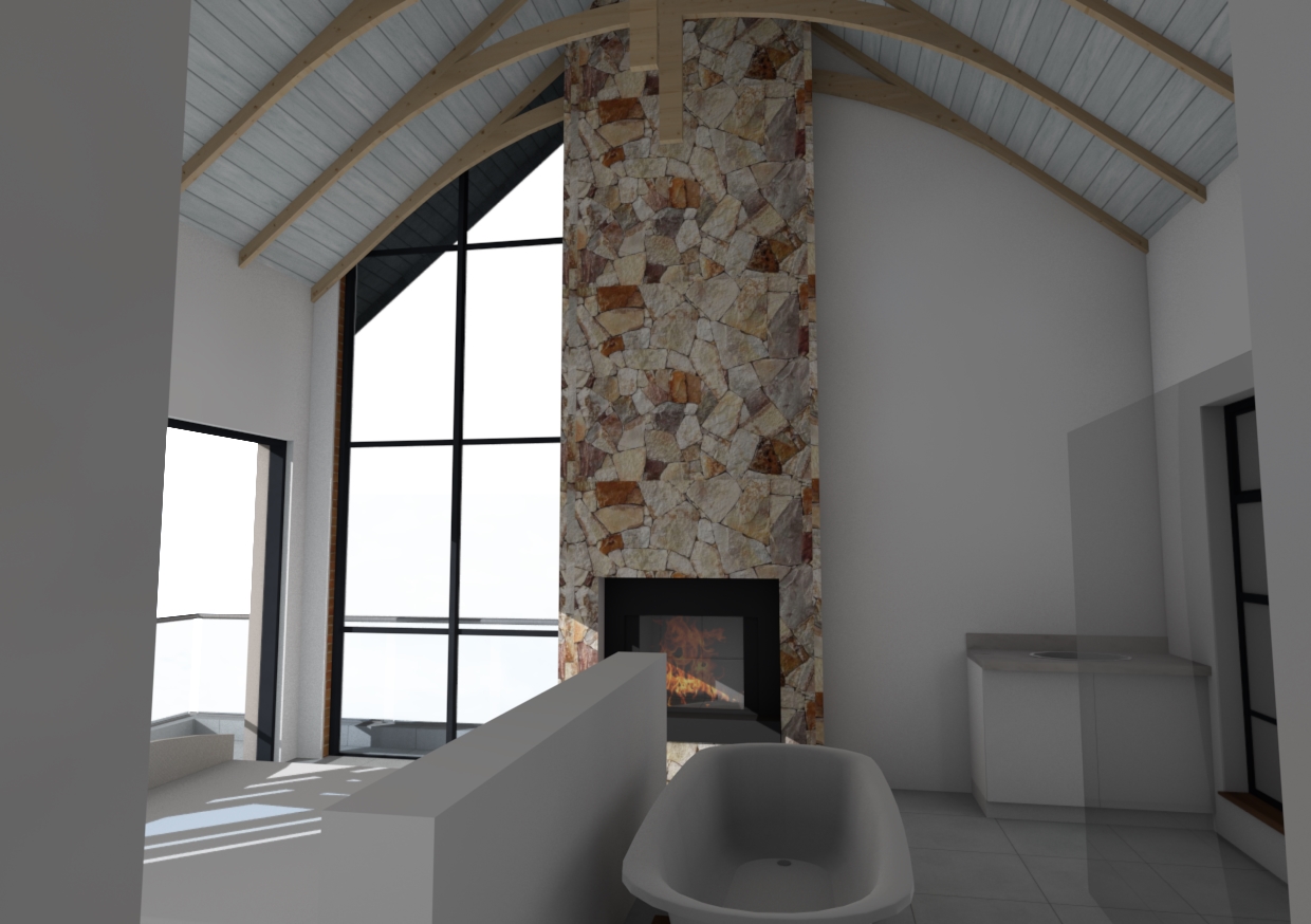 The double volume staircase and entrance hall creates a break in the form of the house while also framing the stunning introductory view South of the estate.