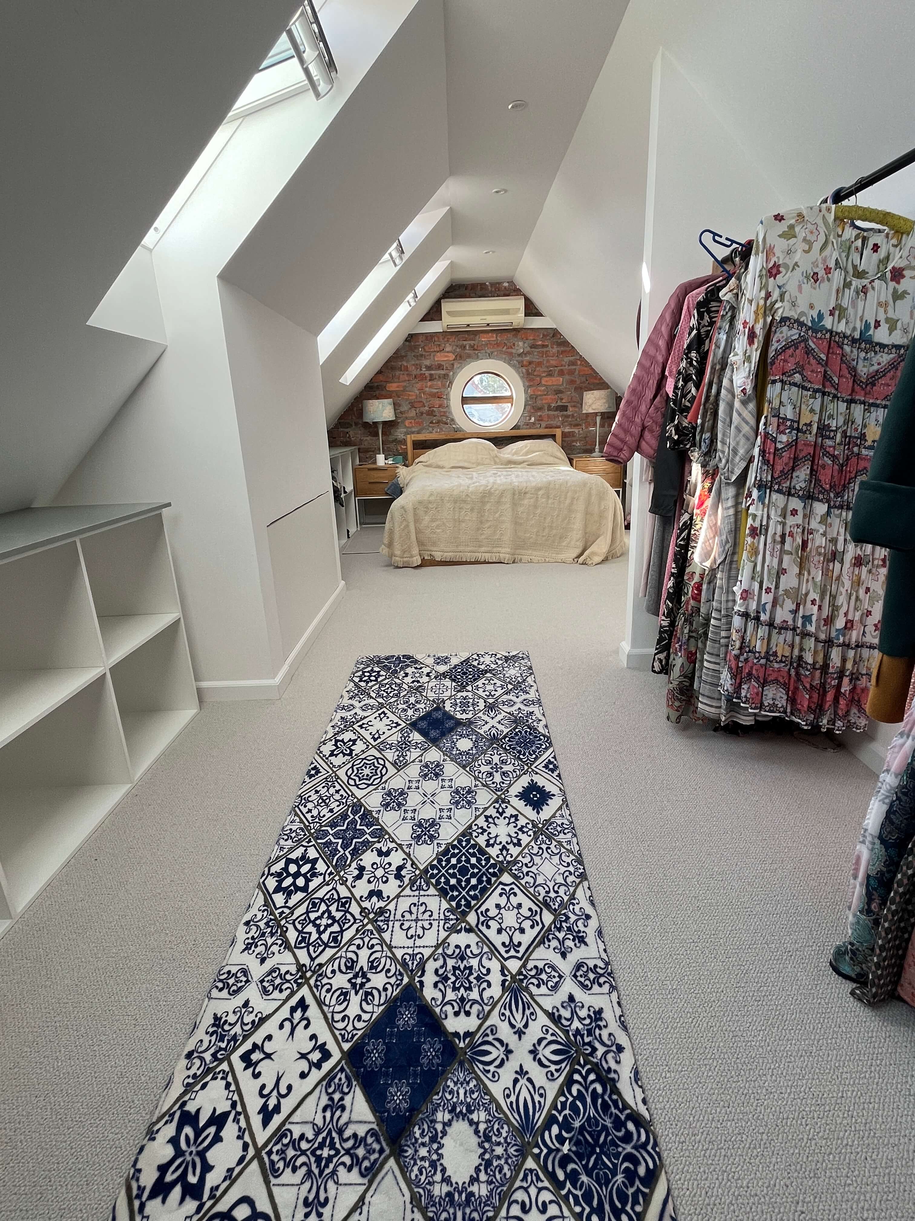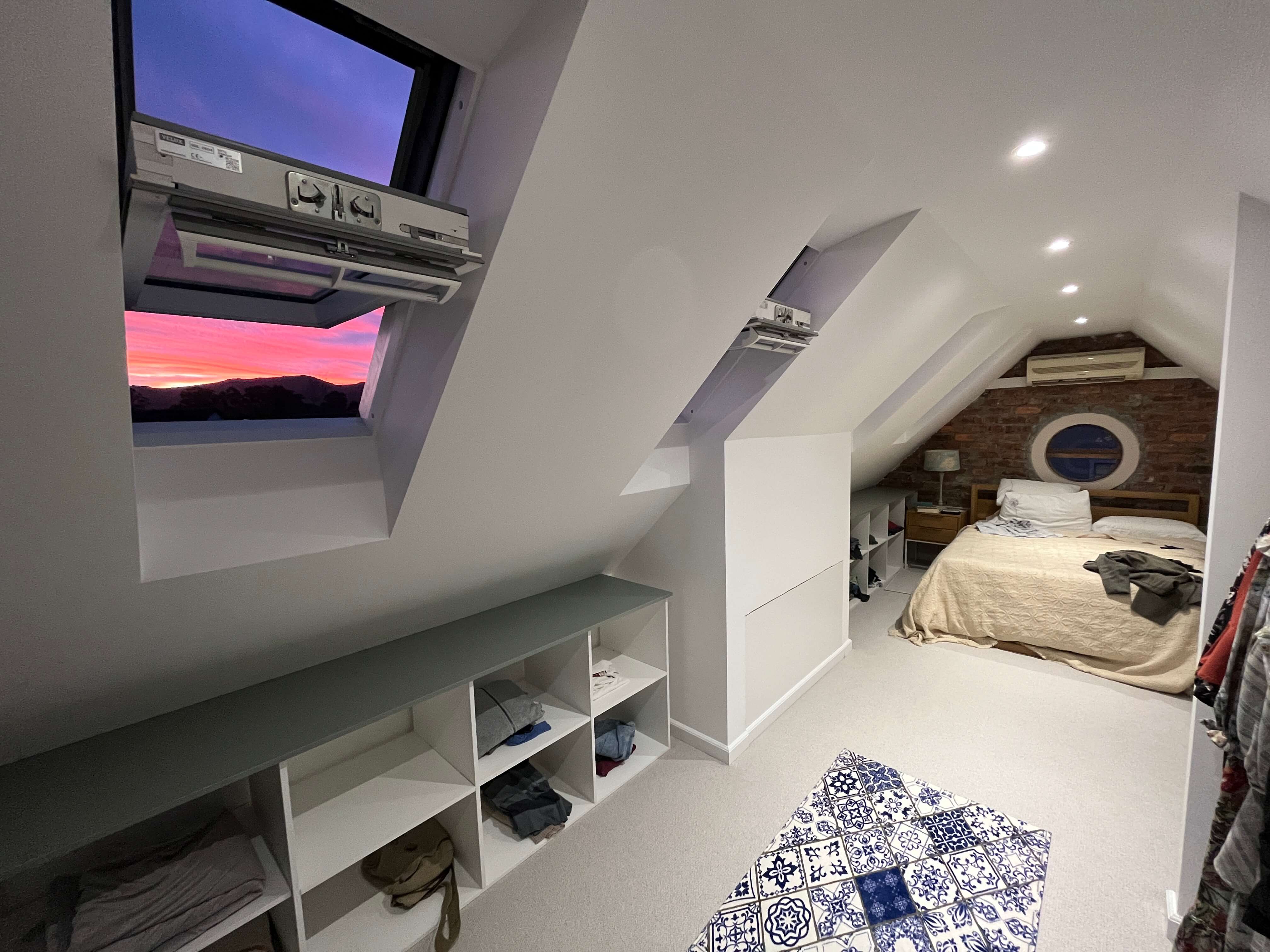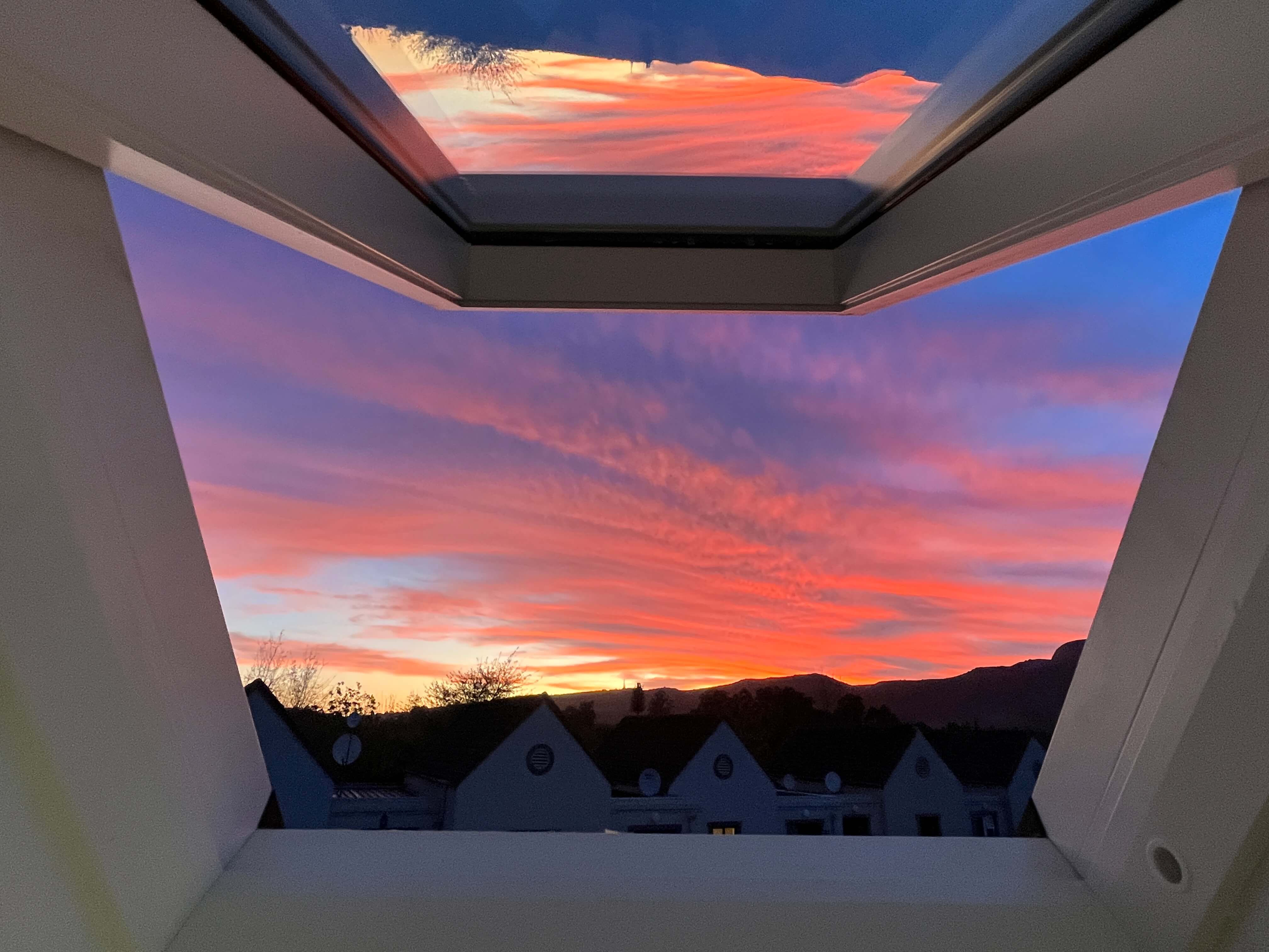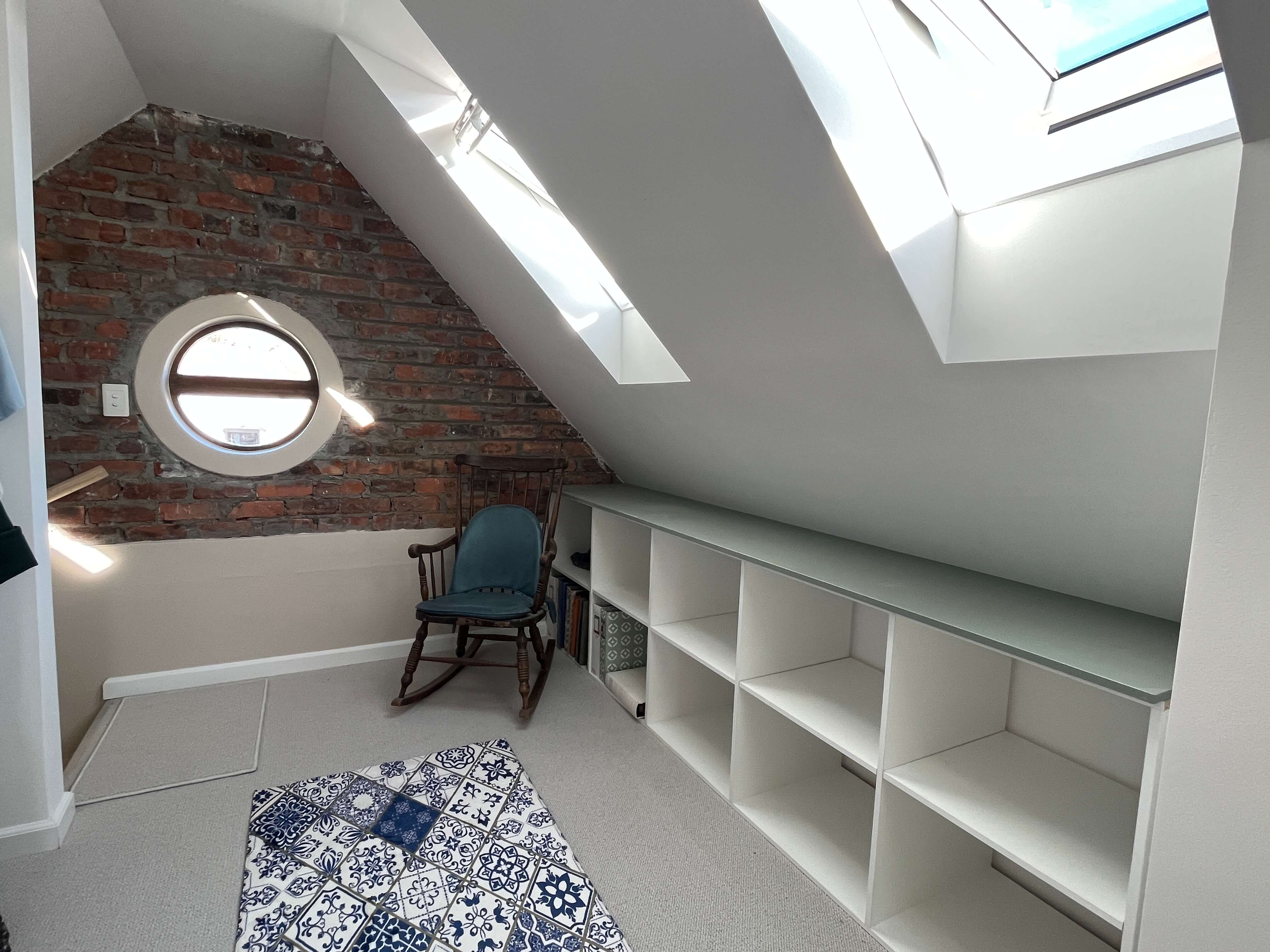 There is something quite special about transforming an unused and forgotten space into something useful. The former ceiling void has been transmuted into a warm and light bedroom loft – high above the sounds of traffic, and closer to the clouds that brush Paarl rock. The imported Velux skylights are double-glazed to make sure the room remains temperate with the golden West-facing sunsets. The skylights also pivot to allow warm air to circulate and escape, thus offering seasonal benefits. The rustic portal windows offer charming peephole views of the mesmerising Cape Winelands.